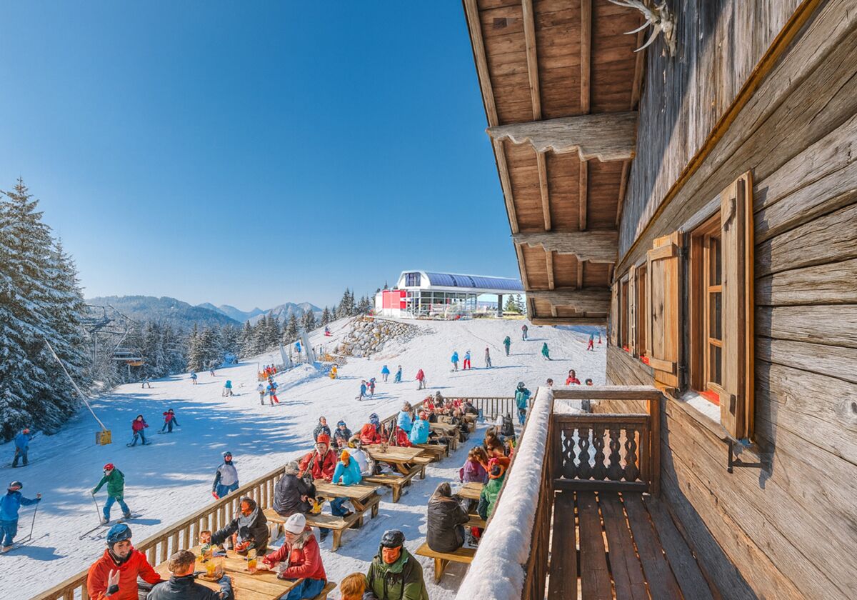 Drinnen uriges Hüttenambiente mit 200 Sitzplätzen, draußen eine große Panoramaterrasse für 400 Gäste – ideal für Einkehrschwung, Skitour oder einfach Sonne tanken.