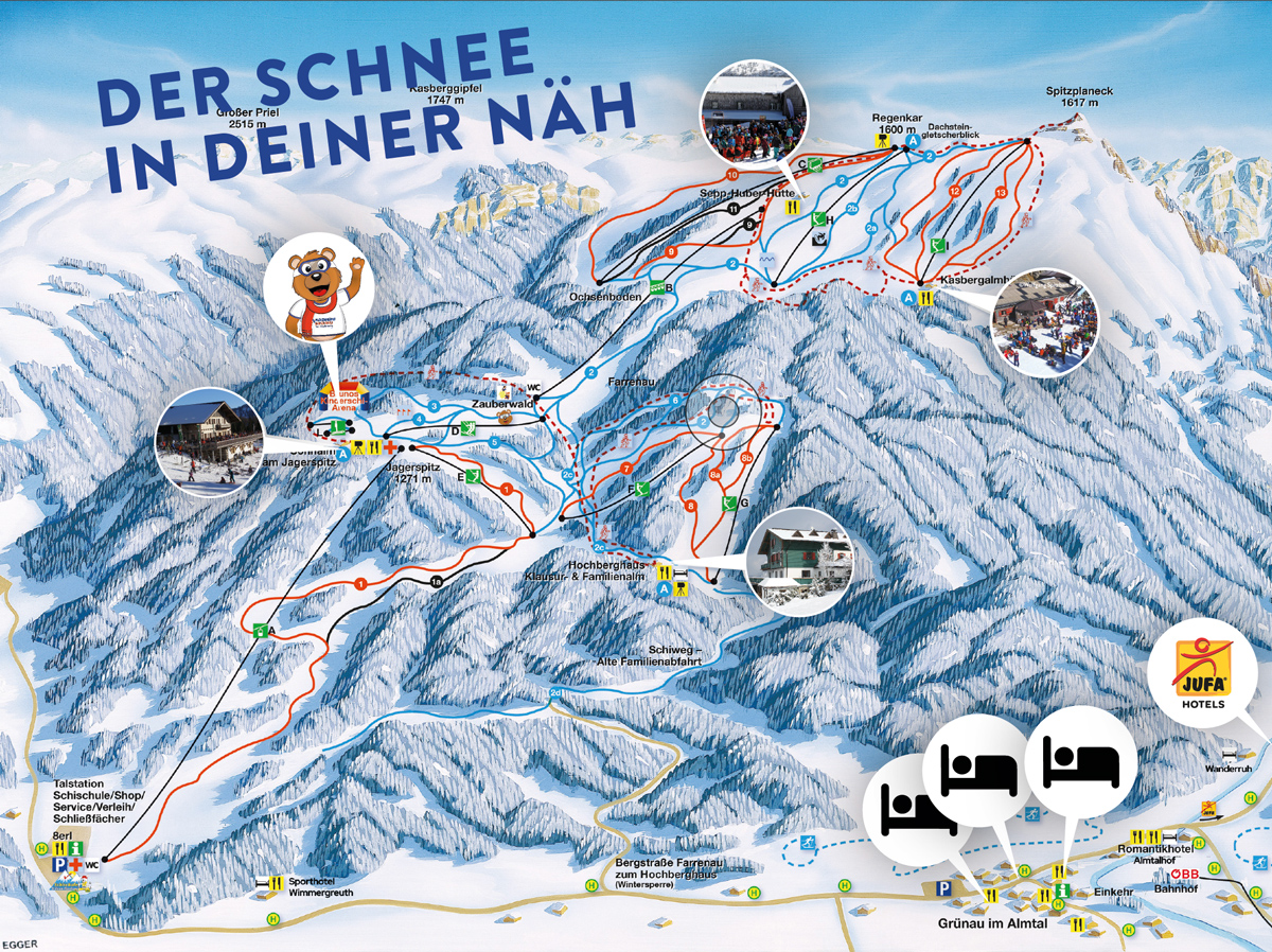 Mehr als nur Skifahren! Das Skigebiet Kasberg liegt in Grünau im Almtal, im Herzen des Salzkammerguts. Umgeben vom Panorama der Salzkammergut-Region lädt der Kasberg zum Skifahren und Snowboarden ein. Erlebe die Natur auf den 21 hervorragend präparierten Pistenkilometern, in der weitläufigen Kinderschiarena mit drei Förderbändern, mit dem Maskottchen Bruno Kasbär, einem super Funpark sowie urigen Hütten mit herzhaften Schmankerln im Familienskigebiet Kasberg. Atme die kristallklare Luft der Region Traunsee-Almtal ein und entspanne dich nach einem Skitag in einer unserer Unterkünfte.